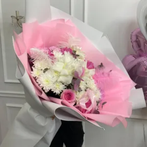 Õrn ja elegantne lillekimp roosade rooside, valgete krüsanteemide ja dekoratiivsete sulgedega. Täiuslik kingitus erilisteks sündmusteks.