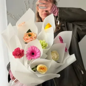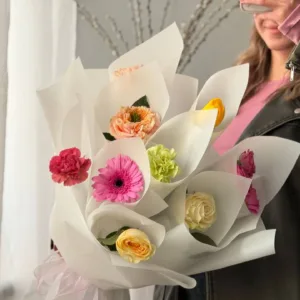 Elegantne roosade toonidega kimp, kus on roosid, nelgid, kipslilled ja õhuline vill, täiuslik kingitus armastuseks.