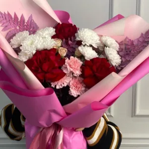 Erakordne lillekimp punastest ja roosadest roosidest, valgetest nelkidest ja fuksiaroosast fernsist. Stiilne roosa pakend.