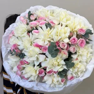 Suur elegantne kimp valgete ja roosade roosidega, kaunistatud eukalüptiga – ideaalne kingitus pidupäevaks.