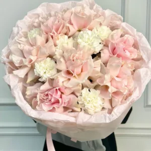 Õrn lillekimp roosadest roosidest ja valgetest nelkidest, kaunis ja pehme pakend.