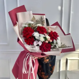 Luksuslik, täiuslikult vormitud punaste rooside kimp koos õrnade valgete õite ja säravate kuldsete lehtedega, mis loob kirgliku ja meeldejääva lilleelamuse.
