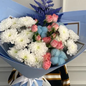 Elegantne sinine lillekimp valgete krüsanteemide, roosade rooside ja siniste dekoratiivsete elementidega – eriline kingitus